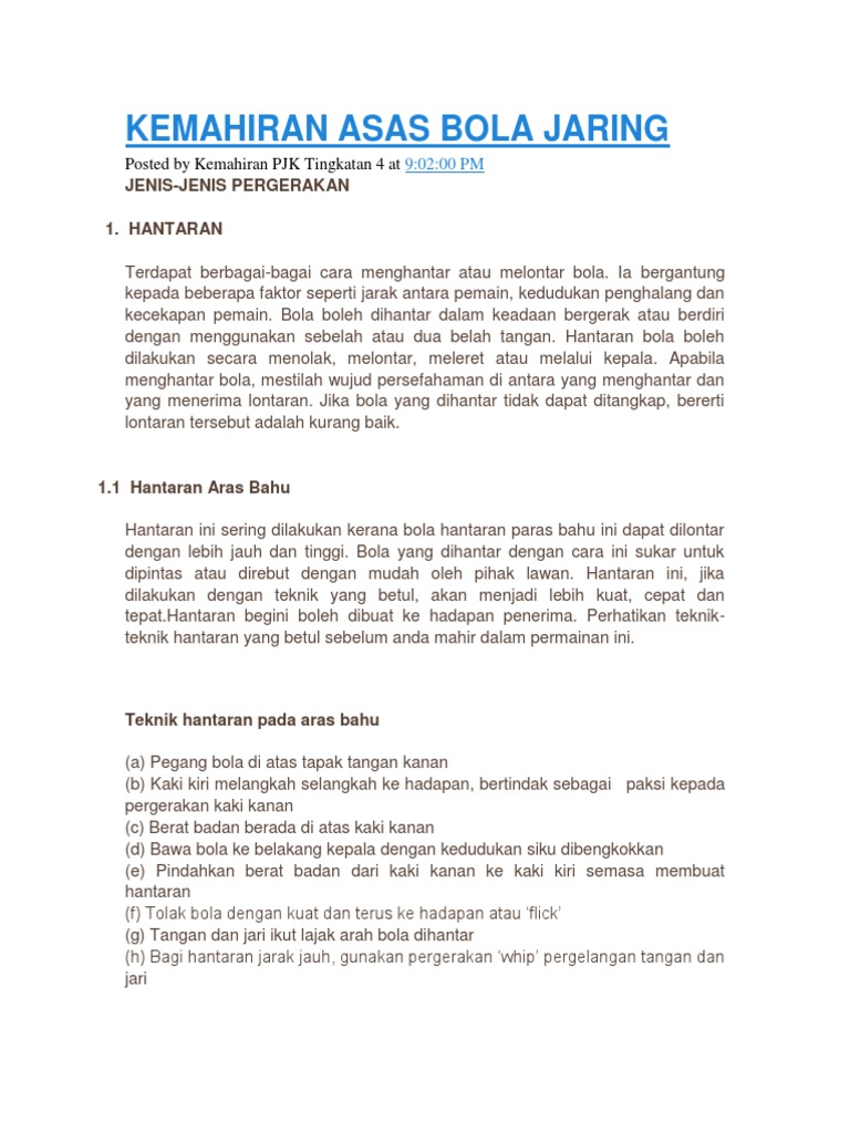 Pemberian penaltiada lima jenis penalti hantaran percuma hantaran penalti hantaran atau jaringan penalti hantaran ke dalam lambungan. Koleksi rancangan aktiviti tahunan persatuan dan kelab admin january 17, 2018 setiap rabu kebiasaannya murid akan mengikut. Bola jaring kini adalah dimainkan dengan cemerlang sebagai sebuah pasukan sukan wanita di australia dan new zealand dan adalah popular. Pasukan yang bertahan melangkaui pasukan berhadapan untuk mengelakkan hantaran bola ke lini tengahnya jenis dan variasi bola keranjang yang lain. Beberapa jenis hantaran di dalam permainan bola jaring ialah